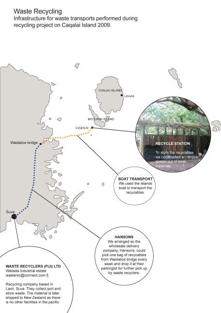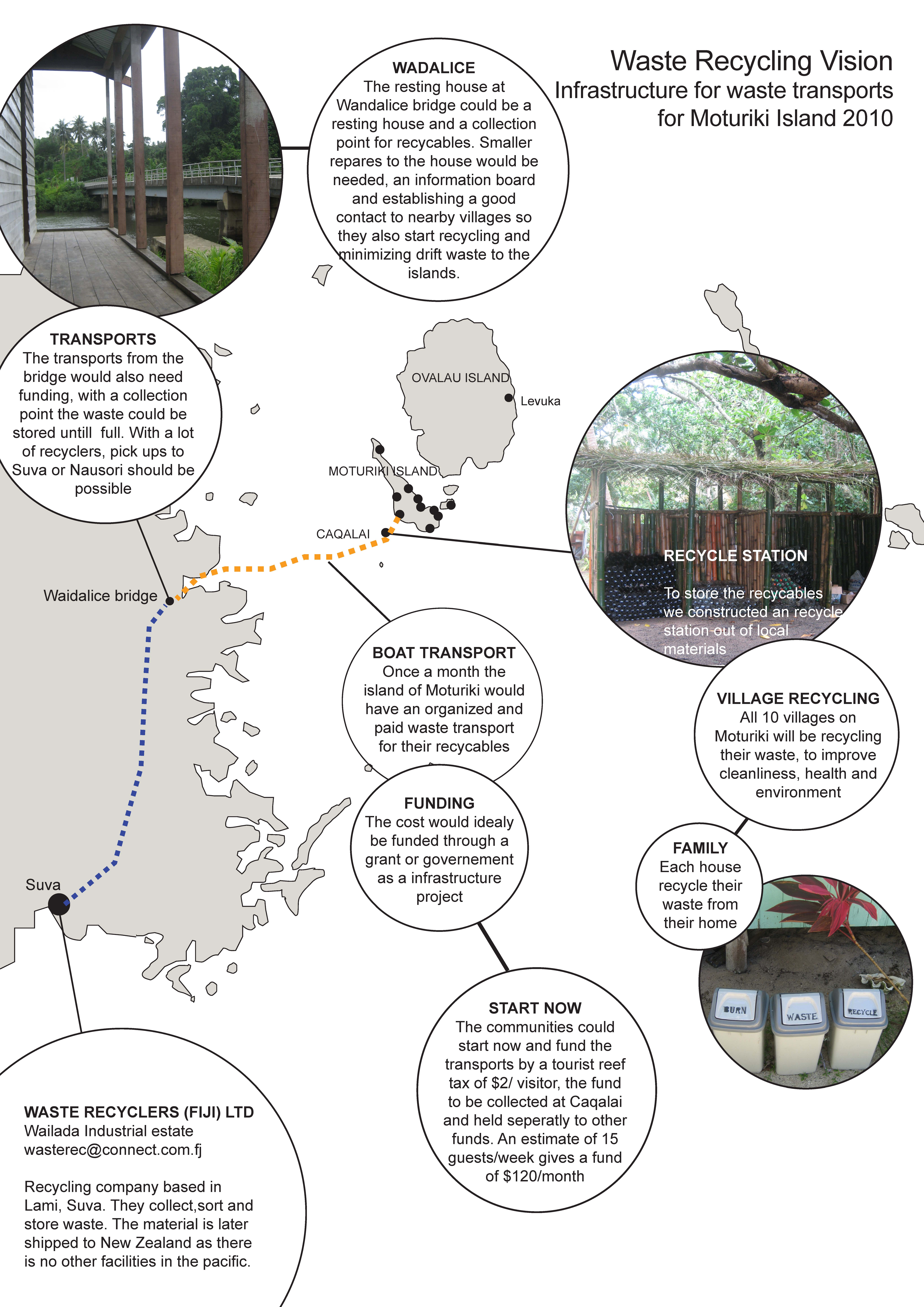 The recycling station built in 2009 in the village of Niubasaga on Moturiki was destroyed in 2010 by cyclone Mick. As a result, a new recycling station was designed and proposed for a more central location in the village. AES also suggested that Moturiki Environmental Committee push for improved infrastructure to deal with the growing solid waste problem for all nearby islands. A proposal to collect a reef tax from visitors to Caqalai Island Resort was made to the new management (the management changed in early 2010) of the resort; the tax would help cover waste transport costs for all villages on the island of Moturiki.