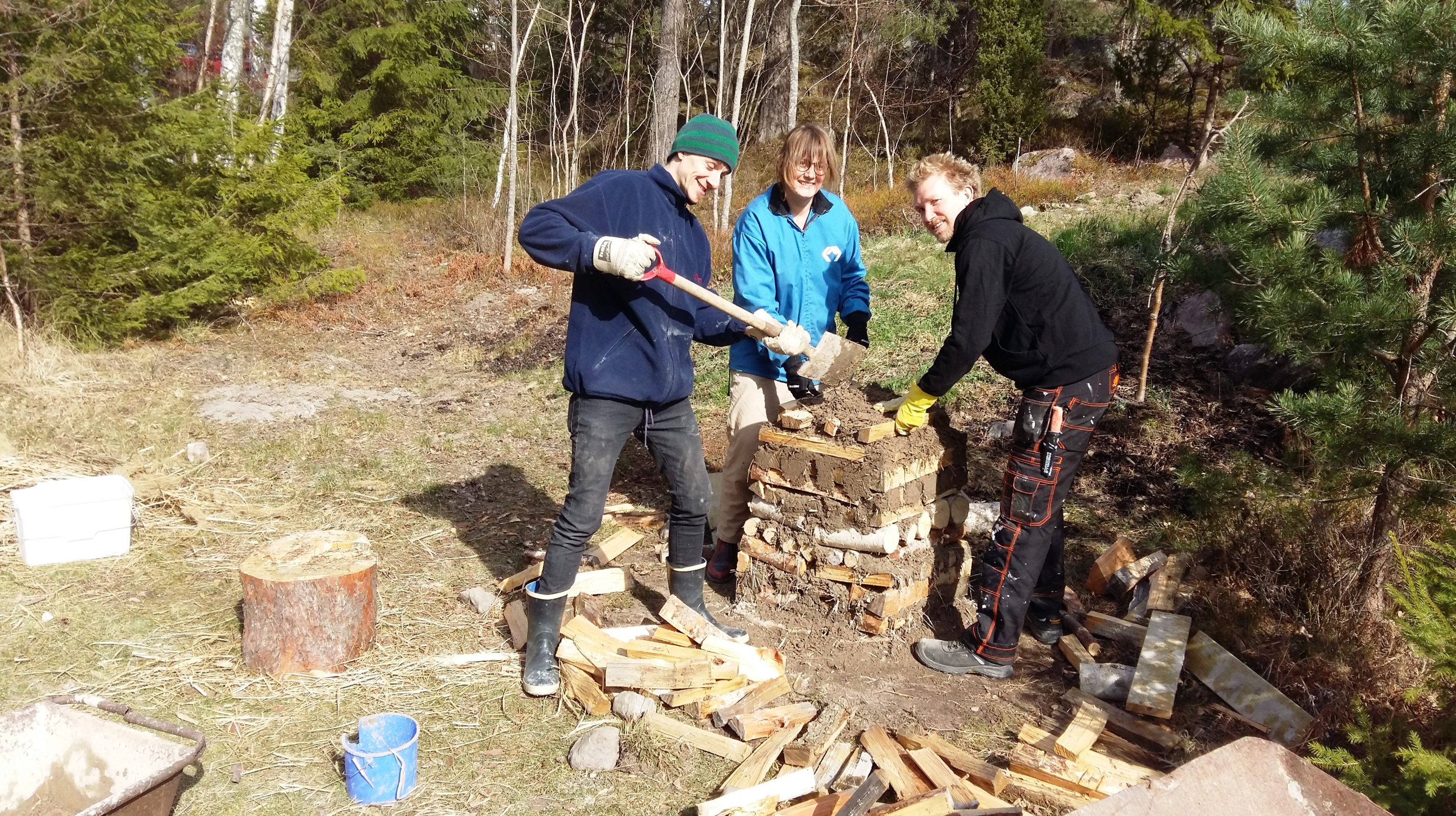 First excavating the clay from the ground, the dense former seafloor had made a layer of solid clay under the top soil. We used dry grass and reeds to strengthen the mortar mix. Sand was gathered from the waterfront, and wood from the previous years clearing. From the small test we learned that little water is needed for the mortar mix, and we also have some need ideas on how to plan the construction and size of the wooden logs used.