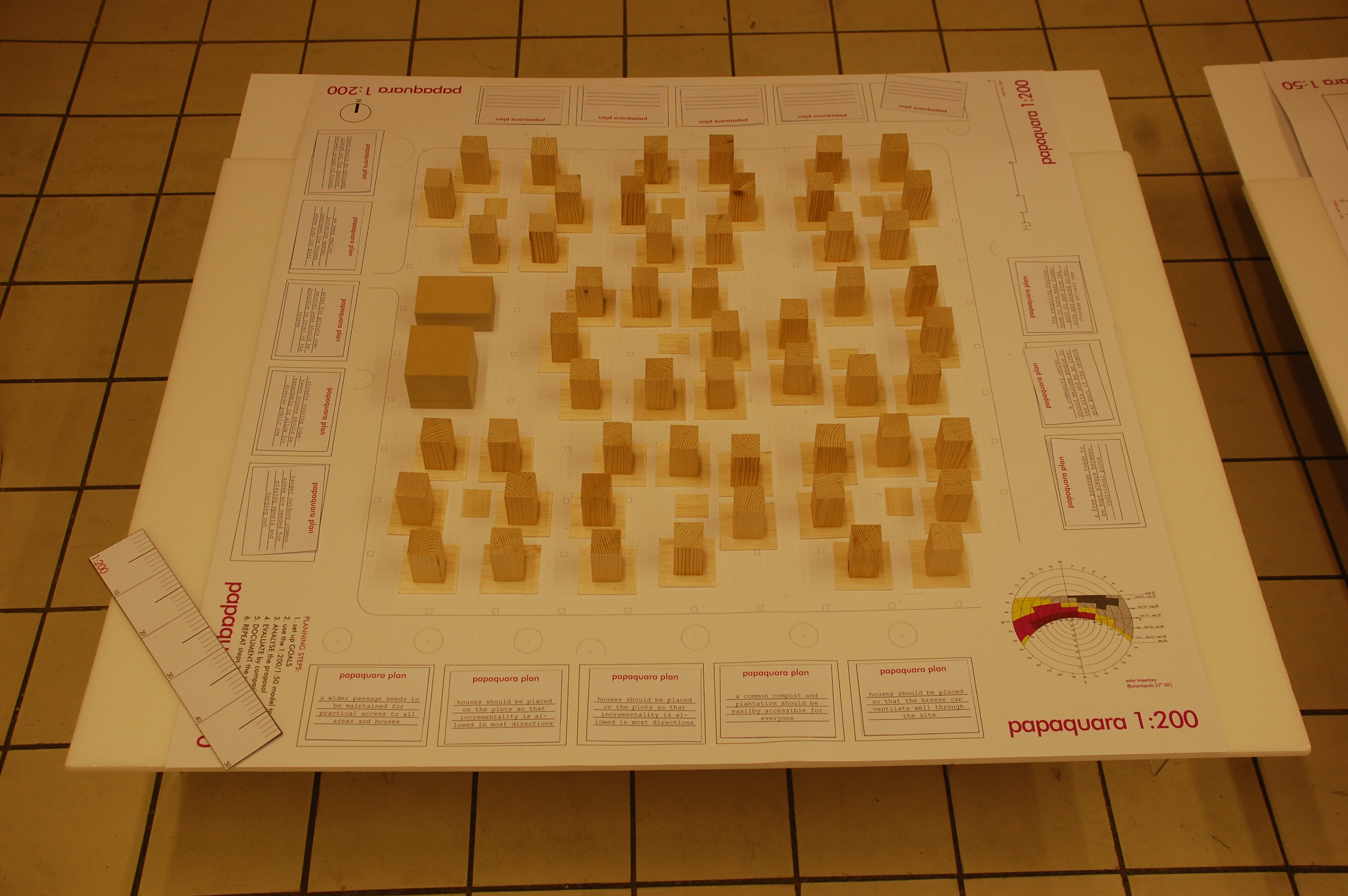 The first method developed was a reverse or cyclical way of planning, where the process starts not in laying down streets and infrastructure, but in establishing spatial qualities that you and your co-planners want the plan to achieve. In practice, this means writing down a set of spatial goals on cards and keeping them close at hand throughout the planning process. Models of the site are needed, preferably in two different scales to be able to experience outcomes both from a distance and more closely. To make things handy, the models/plans should be cheaply and easily produced, built from simple materials and clear in their communication. From here on, you start the planning by making different versions of the model that you can compare, analyse, discuss and document in a cyclical process, until a result is reached that everyone or at least most people included in the process can agree on. This way the planning becomes more experimental and less focused on finding one imagined perfect solution. The relationships between the houses, and between houses and common spaces and the site is allowed more importance in the first round than establishing limits, streets and plots. The intention of the planning tool is also to be useful irrespectively of setting; in an academic institution, together with a group of community residents, or in a meeting with public authorities.
