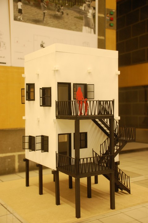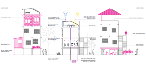 Money being scarce in a social housing program like this one, assets have to be directed to where they are most needed, and where they are most likely to enable future development. In the construction phase, what is built is a good climate shell and one complete wet core on the ground floor, with kitchen and bathroom. Money is not spent on interior division walls, since these have no specific requirements and can be added by the inhabitants using whatever recycled or cheaply bought material they can put their hands on. Instead, money is put down towards a protective layer of plaster on the inside and outside, as well as perforated concrete nibs protruding from the loadbearing construction. Although development is hard to foresee exactly, incrementality is to be expected as families expand over time and needs to be facilitated. An effective way of doing this is to provide parts of the loadbearing structure that can help carry the weight of any new add-ons. The roof is divided into one proper slab and a second structure of a light metal roof, creating a ventilated space inbetween suitable for keeping water tanks.