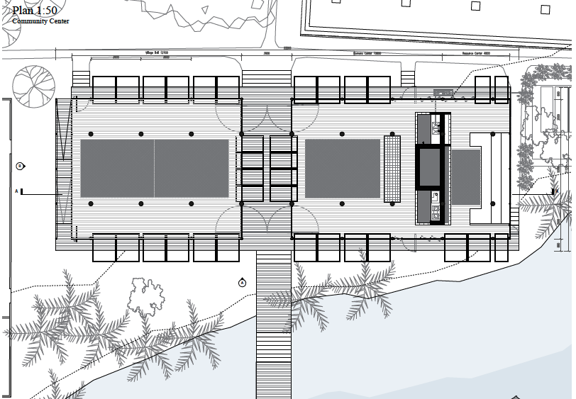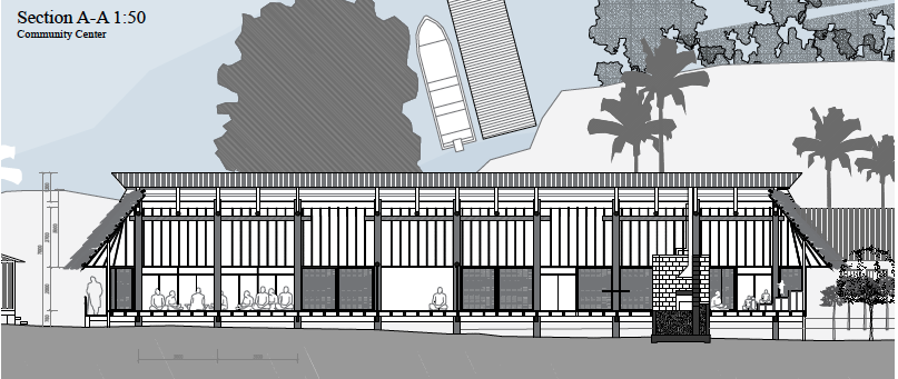 The proposal, a new Community Center, Vale ni soqo. In this building multiple functions are included to respond to the needs of the village. It has space for meetings and larger gatherings. The space can be used as one big structure or two separate spaces if there are multiple gatherings taking place. A youth center for learning and studying, that can be lit at night for homework and talanoa (storytelling) sessions. There is a communal kitchen for the village to ease the massive catering needs for large functions. It collects water from the roof so it is easily accessed and a large workbench.