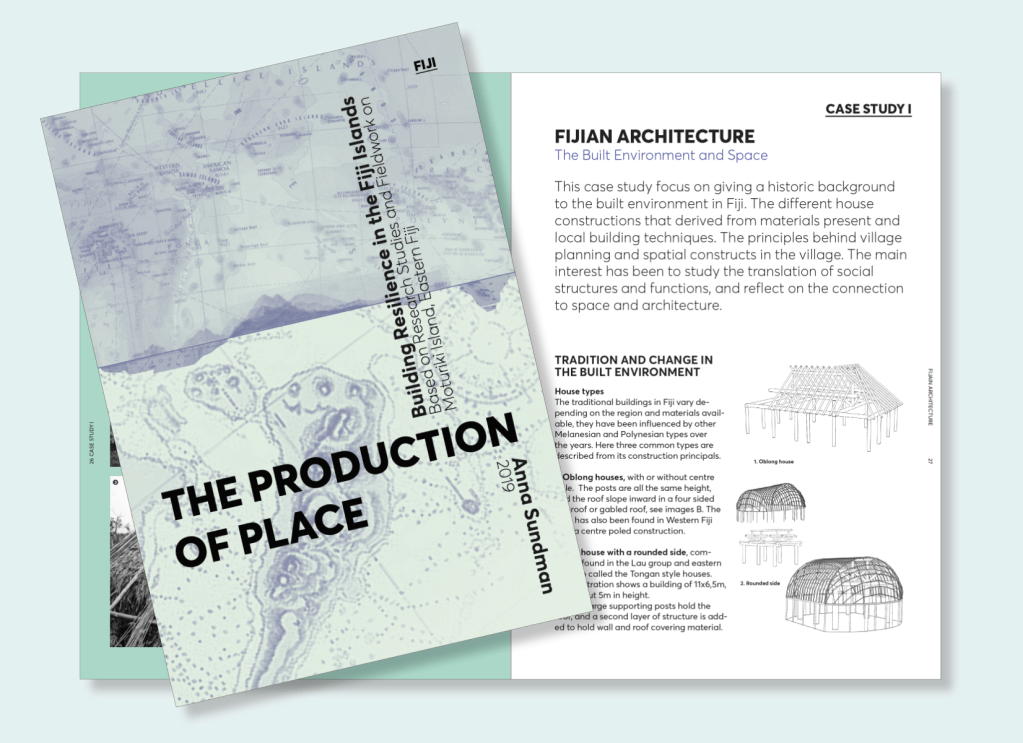 Studie av arkitektur och kultur från ön Moturiki, i Lomaiviti-gruppen i östra Fiji. Studien bygger på ett flerårigt arbetet av arkitekt Anna Sundman som bott på ön och arbetat i flertalet utvecklingsprojekt med lokalbefolkningen. Studien väver samman upplevelser på plats, arkitektur och vardagsliv.